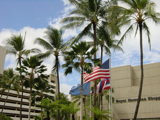 Blue sky over O'ahu: Palm trees, flags of the Sheraton, America and Hawaii