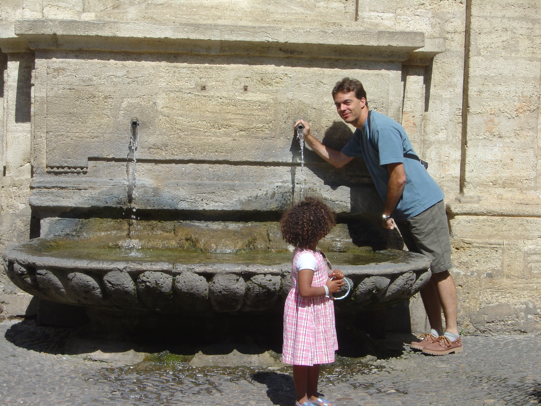 Steph se desaltere a une fontaine sous le regard intrigue' d'une petite fille