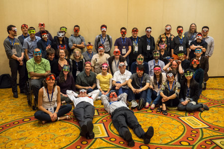 We held a party with chocolate cake and Halloween masks, a few weeks ahead of Ian's birthday, since a lot of the W3C team was gathered in Santa Clara for TPAC 2014. A few days prior, Susan wrote to w3t-less-ian@w3.org and invited folks to celebrate with cake after work on Thursday, and stop by the registration desk anytime to sign a TPAC t-shirt for Ian.