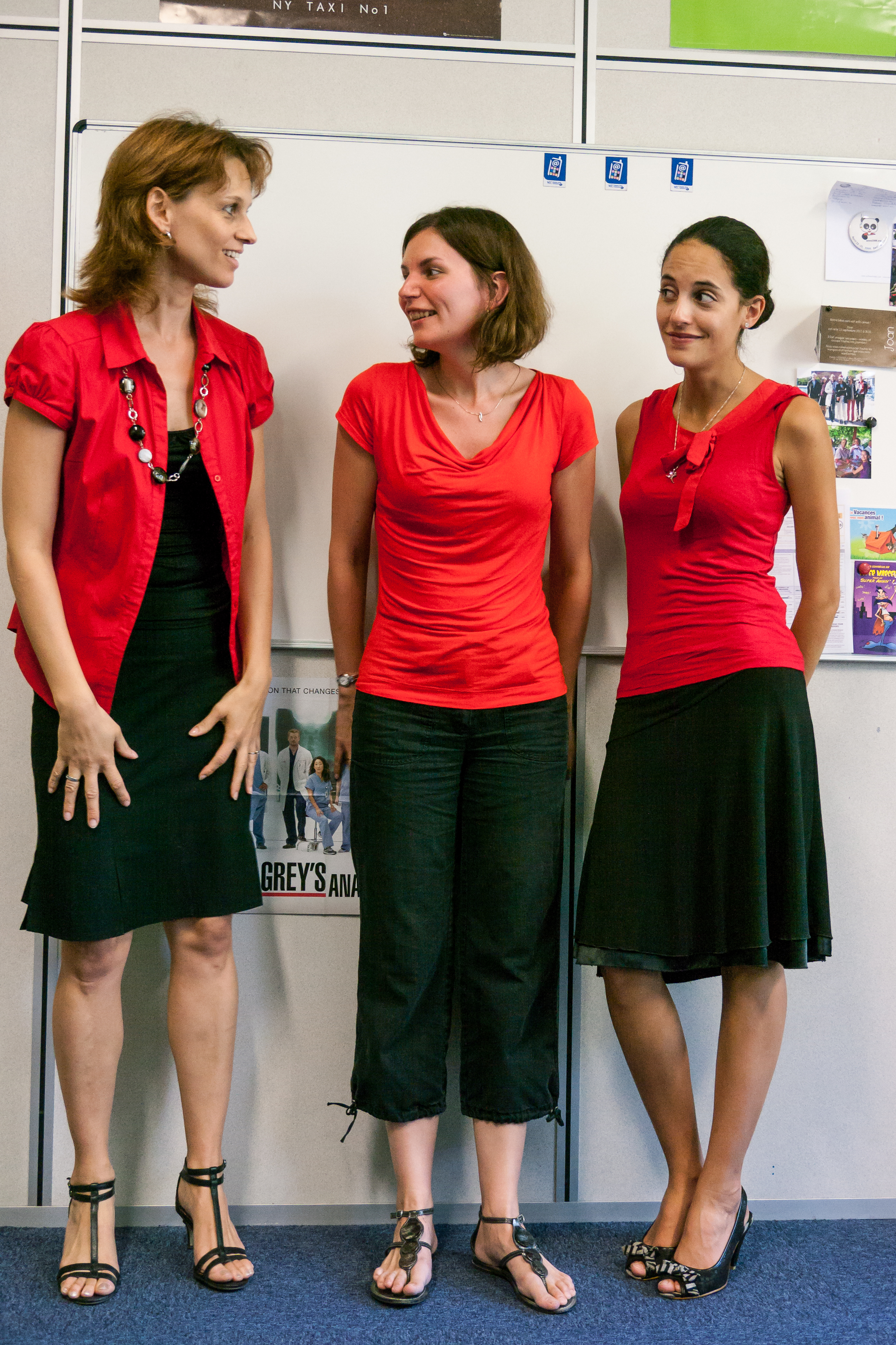 Tuesday 3 July 2012. Caroline, Alexandra and Amandine showed up at the office wearing the same colours. Fortuitously. Self-dubbed the Stendhal Team, because of the novel The Red and the Black, they agreed to pose together at Bert's request. Thanks, girls, for posing! You look splendid (regardless that your colours match).