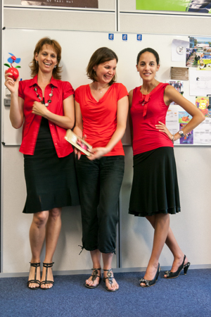 Tuesday 3 July 2012. Caroline, Alexandra and Amandine showed up at the office wearing the same colours. Fortuitously. Self-dubbed the Stendhal Team, because of the novel The Red and the Black, they agreed to pose together at Bert's request. Thanks, girls, for posing! You look splendid (regardless that your colours match).