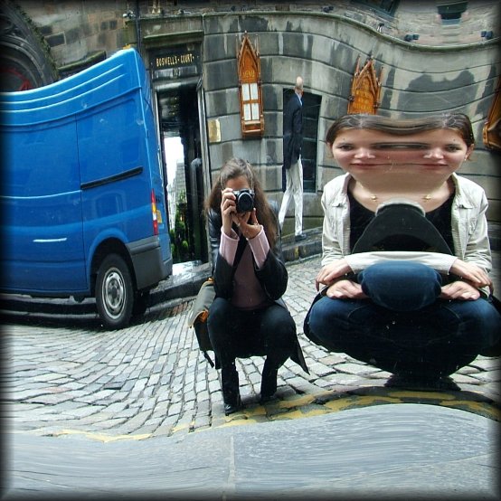 Distortion mirror, Camera Obscura. Little Coco and two-headed tall Alex