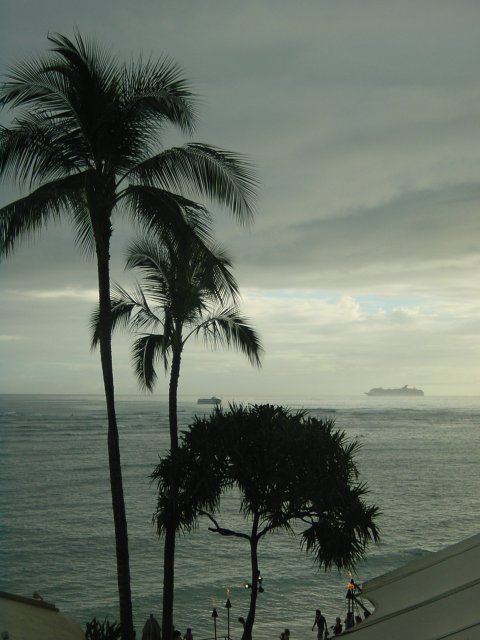 Grey weather, palm trees in the foreground, grey ocean, two ships and grey sky