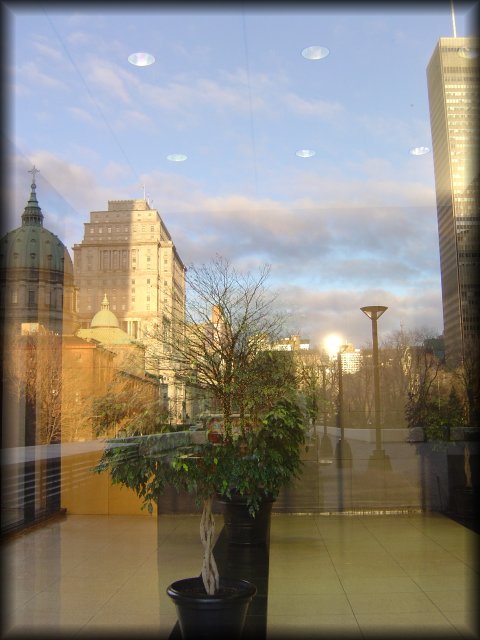 Reflection of buildings in a window and ficus tree on the other side, on a sunny day