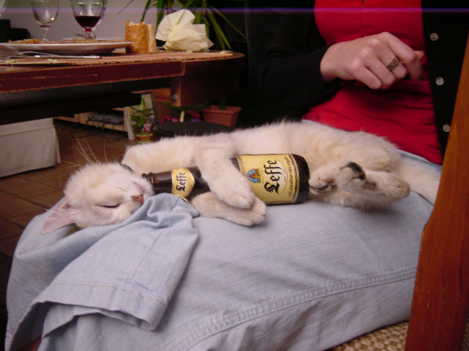 Emu sound asleep, holding an empty bottle of beer between the front paws