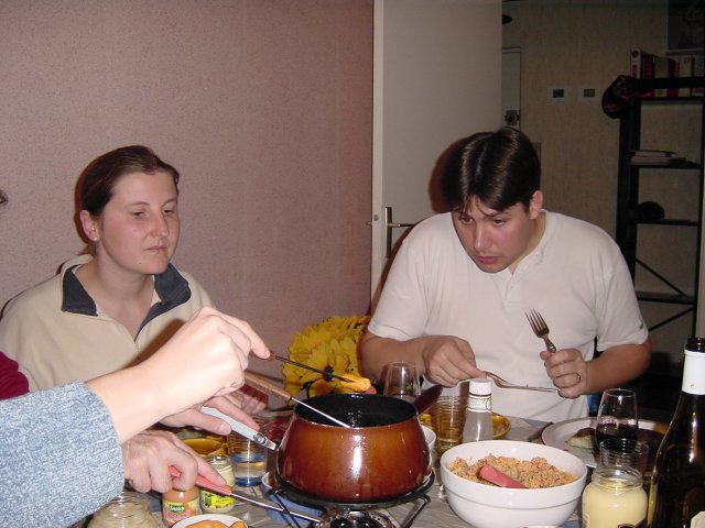 A l'attaque!! Mains de Carine et Yves, Fredo attend son tour et Bi se prepare, fourchette en main