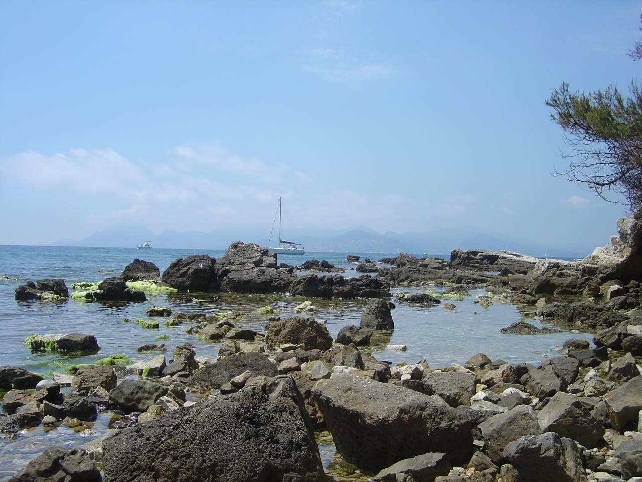 Rochers dans l'eau, voilier, l'esterel dans le fond