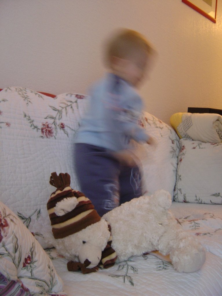 More dancing on the couch, with the teddy bear not far this time