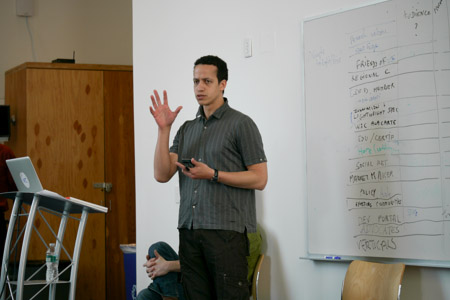 Dom giving a lightning talk, and holding a device he was reading notes on. His speech was about how discussions should happen outside of the W3C domains, and how Domains are harmful (see slides.)