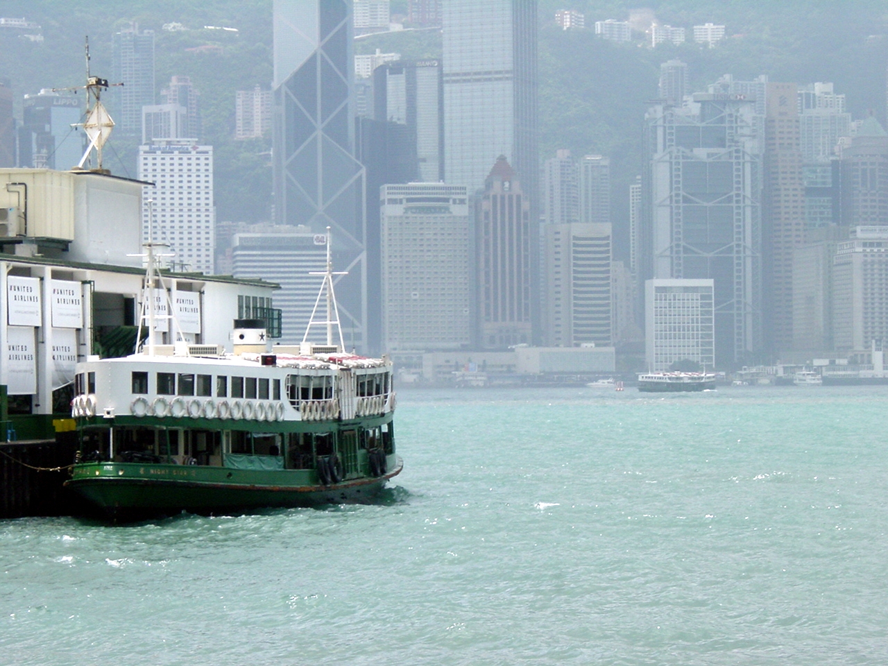 Ferry boat moored at Kowloon, HK island in the background