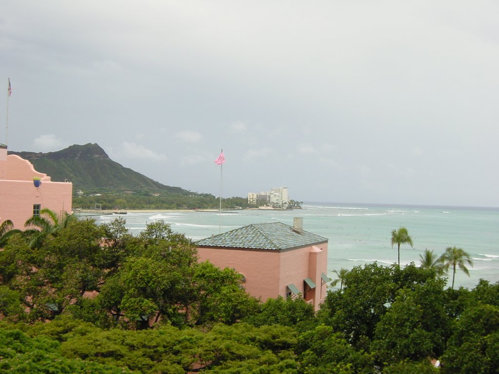 View from Amy'r room on the Royal Hawaiian Hotel (pink building), Diamond Head and the ocean