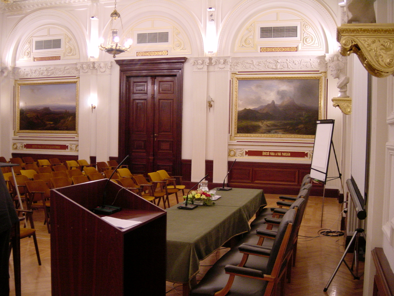 Room of the event: podium, speaker table, screen, rows of chairs, paintings on the wall, etc.