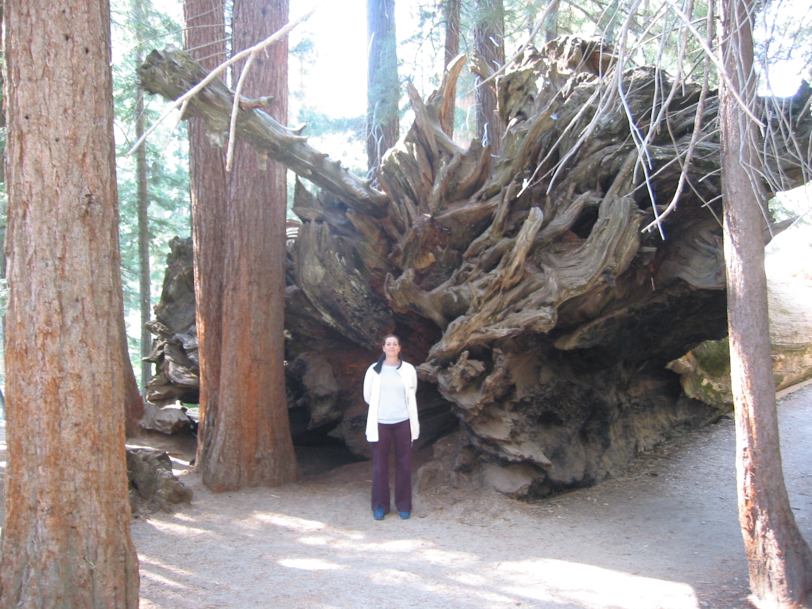 Coralie in front of the roots of a fallen sequoia