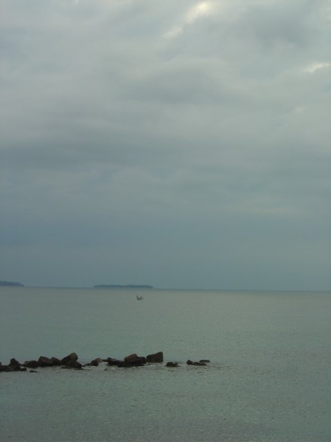 Cloudy morning: Iles Sainte-Marguerite and Saint-Honorat in the background, fishing boat and rocks in the water