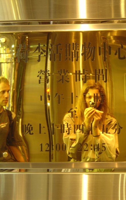 Nico and I in the reflection of a brass plate