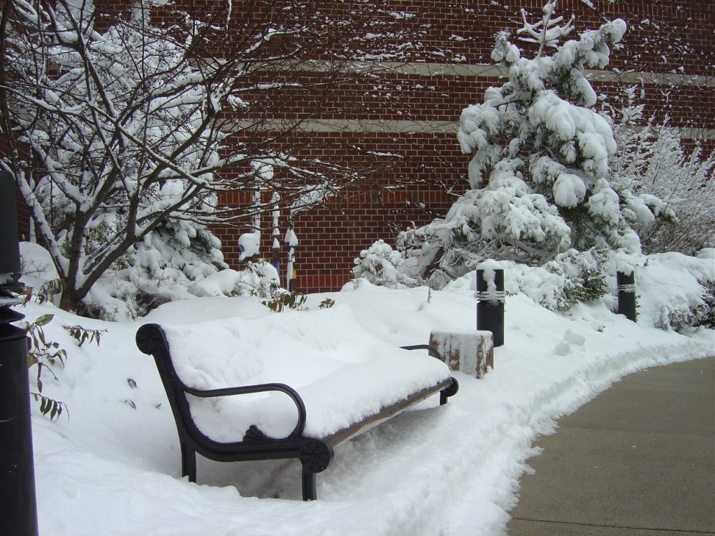 Snow on the bench and in the tree, Hyatt Harborside, Boston