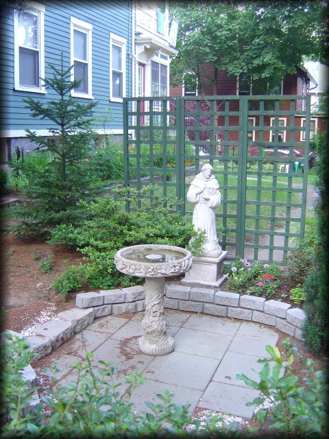 Saint Francis in a garden, next to a fountain