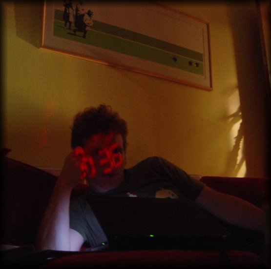 digital clock projected on ericP's face
