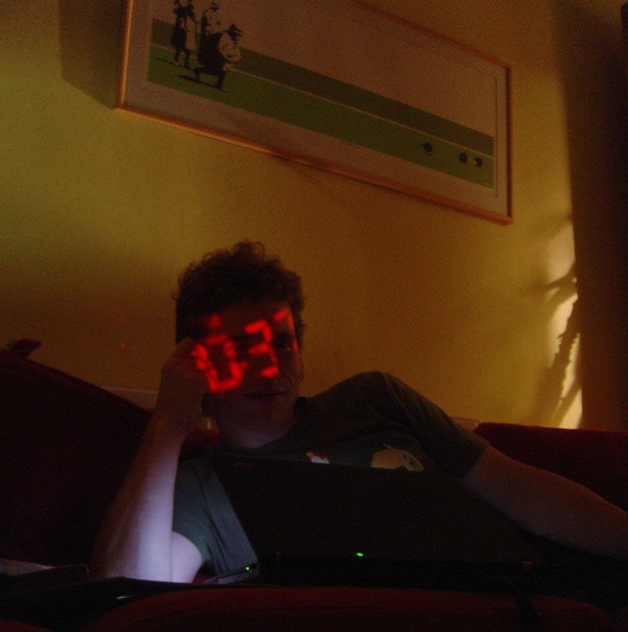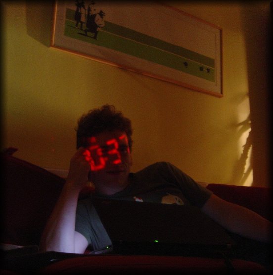digital clock projected on ericP's face
