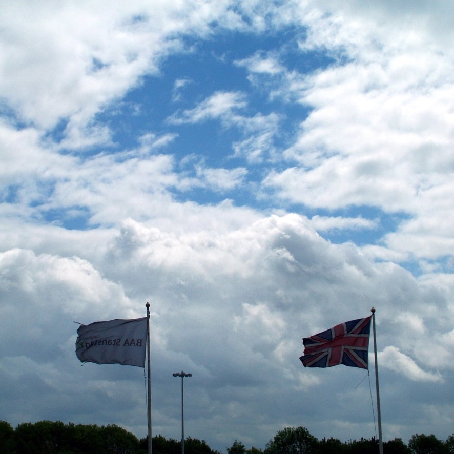 At Stansted airport between two flights. Flags against the sky.