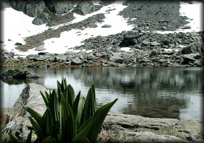 This was at the "corner" of the lake, a little further after where we ate and I crouched to catch the plant and the still-ish water, and snow and rocks.