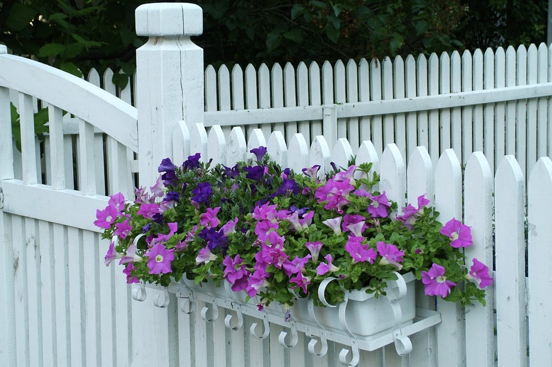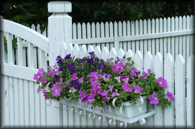 A white fence and gate and purple and pink flowers.