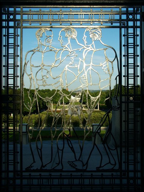Wrought iron gate at the Vigeland Sculpture Park featuring three naked men on their way. Right pane.