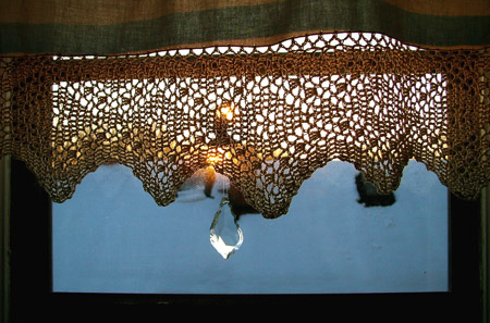 It snowed again last night, and the roof is all white. A crystal shaped like a drop hangs against the window pane, just below the curtain. It mirrors patches of light and patches of shadows. The sun is rising just above the roof.
