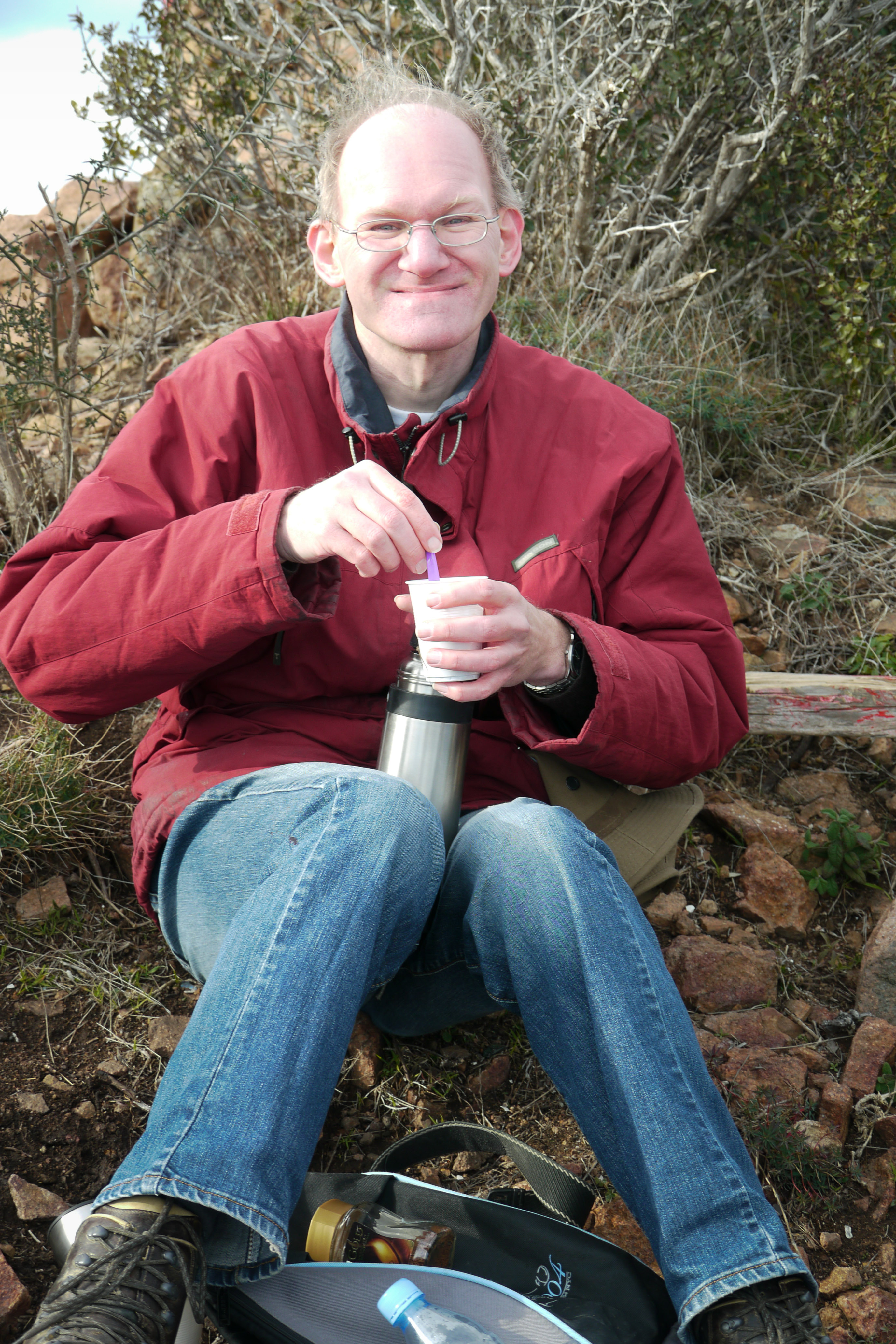 Bert stirring suger in his coffee. Bless his Cotton socks, he brought coffee and enough cups for us!