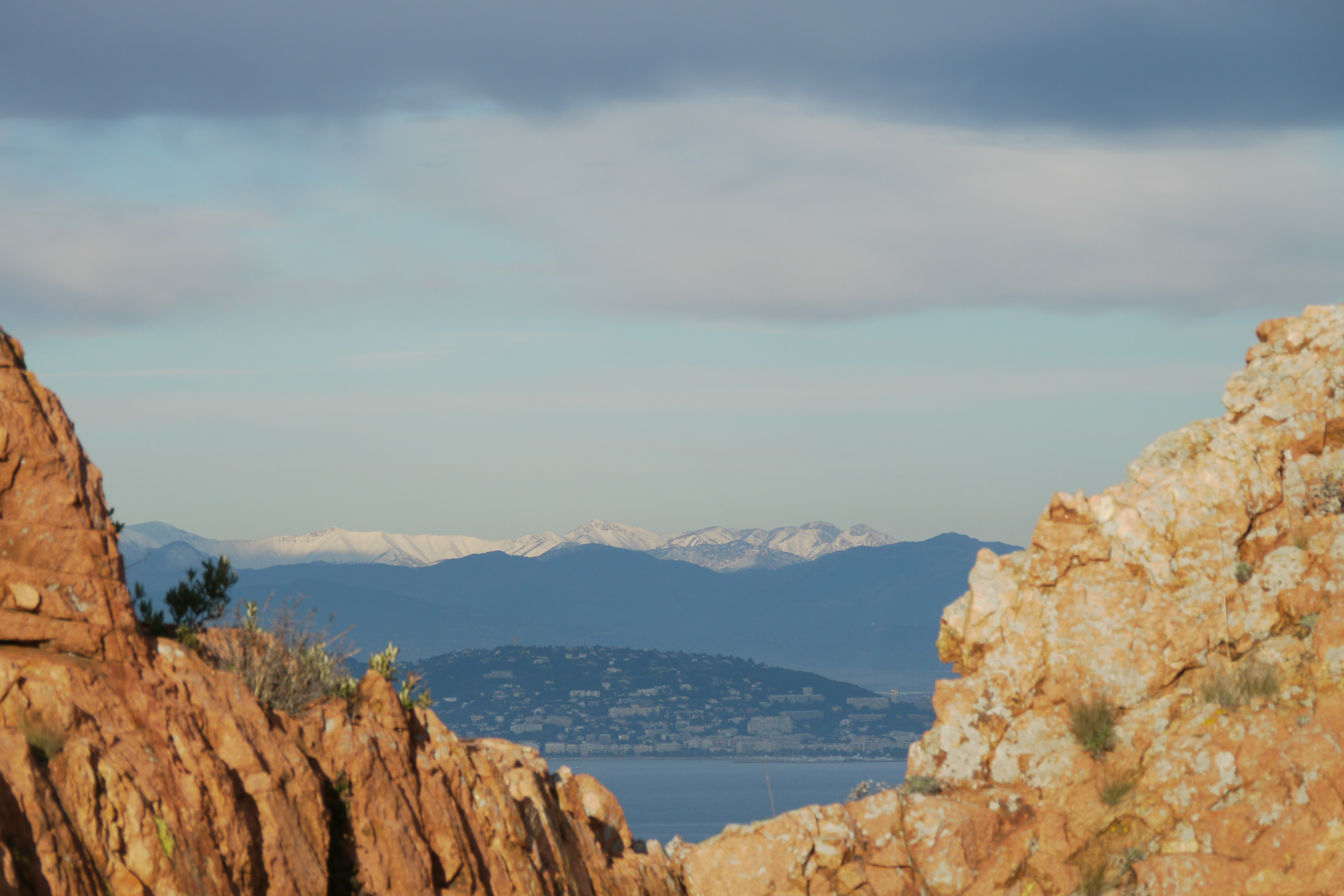 The Alps and snow, mountains, Cannes, the sea. Framed by big reg rocks.