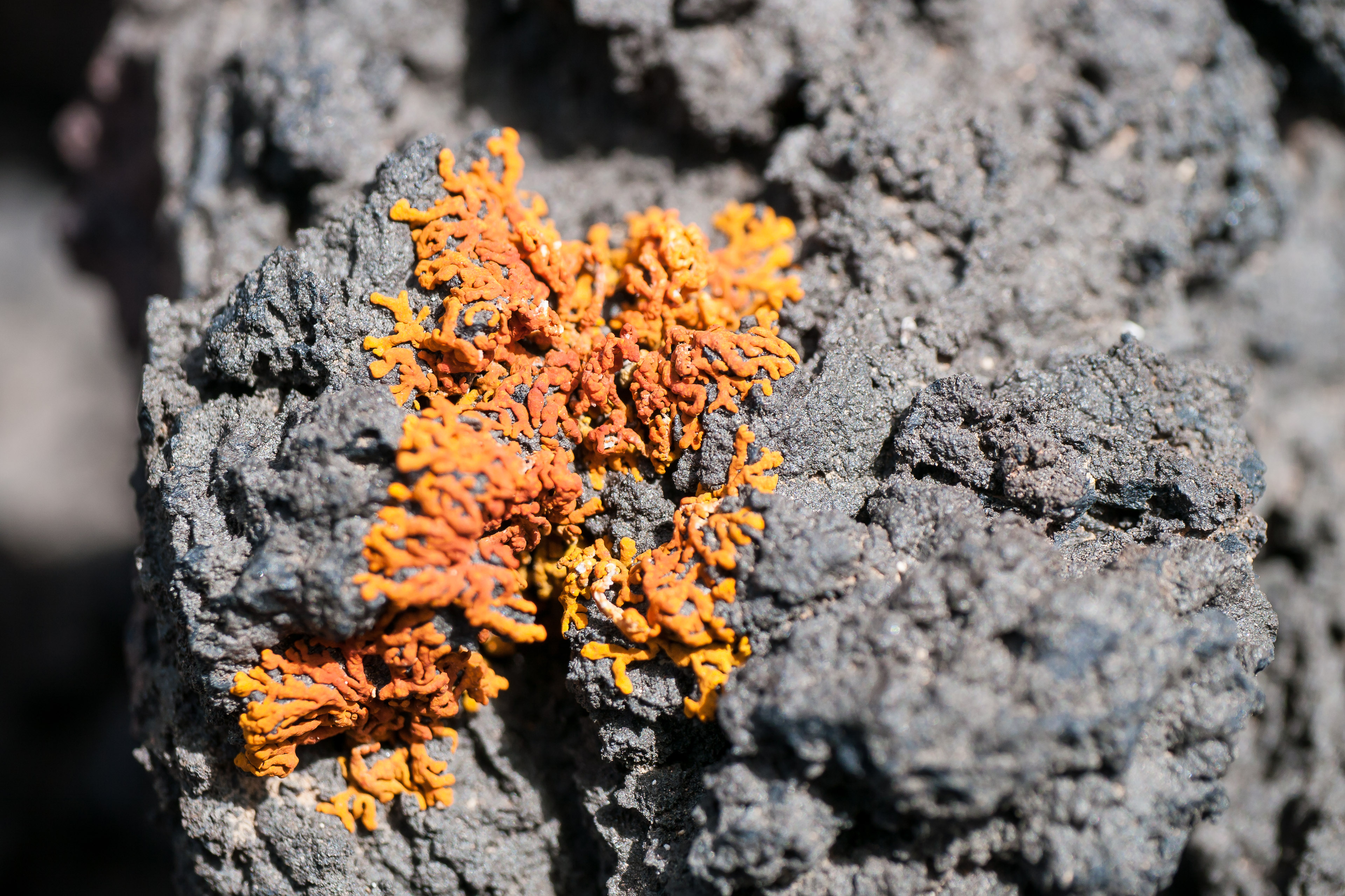Bright orange lichen on dark grey volcanic rock.